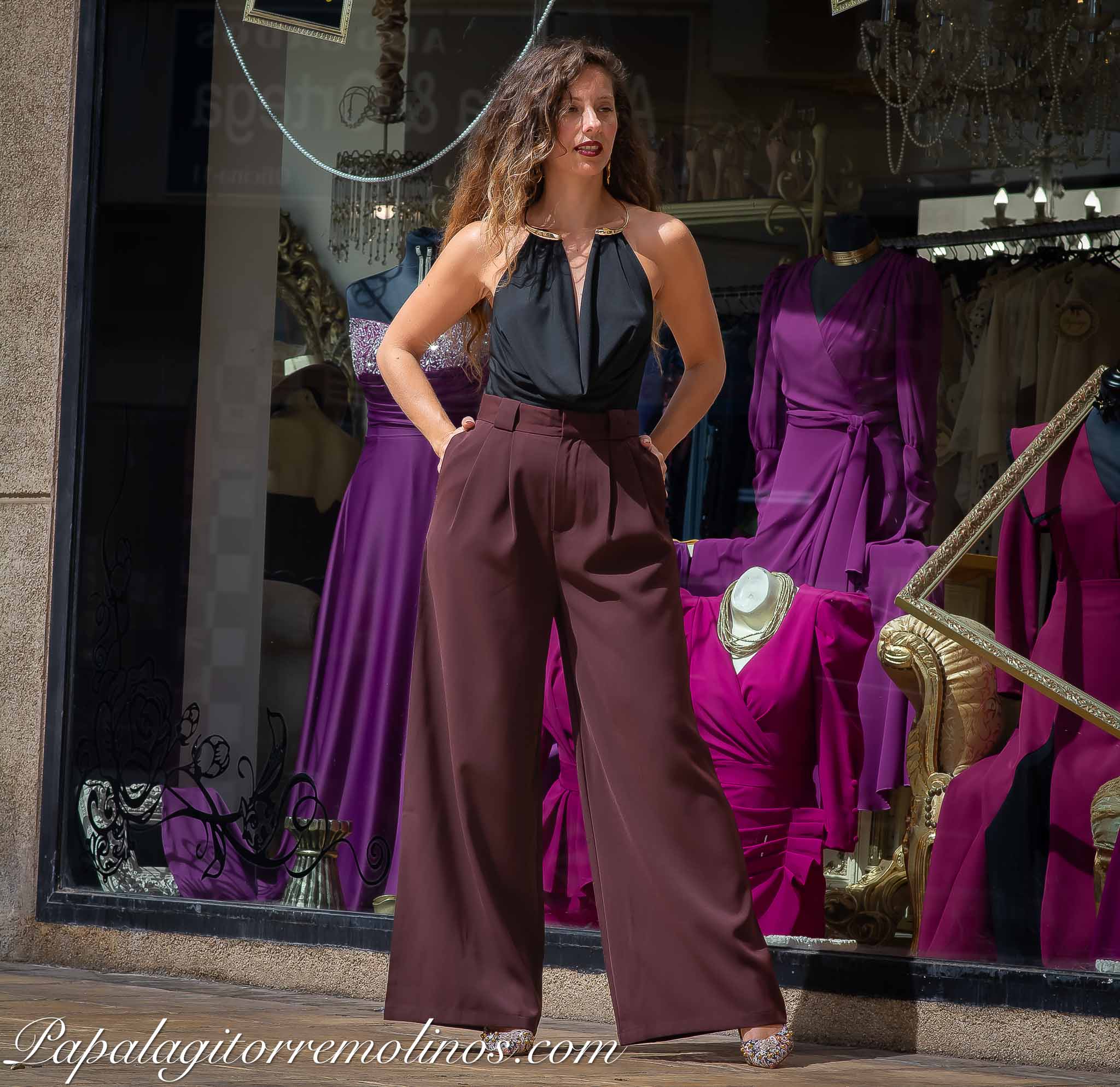 Precioso body cuello halter de collar en dorado, escote de cascada y espalda descubierta.