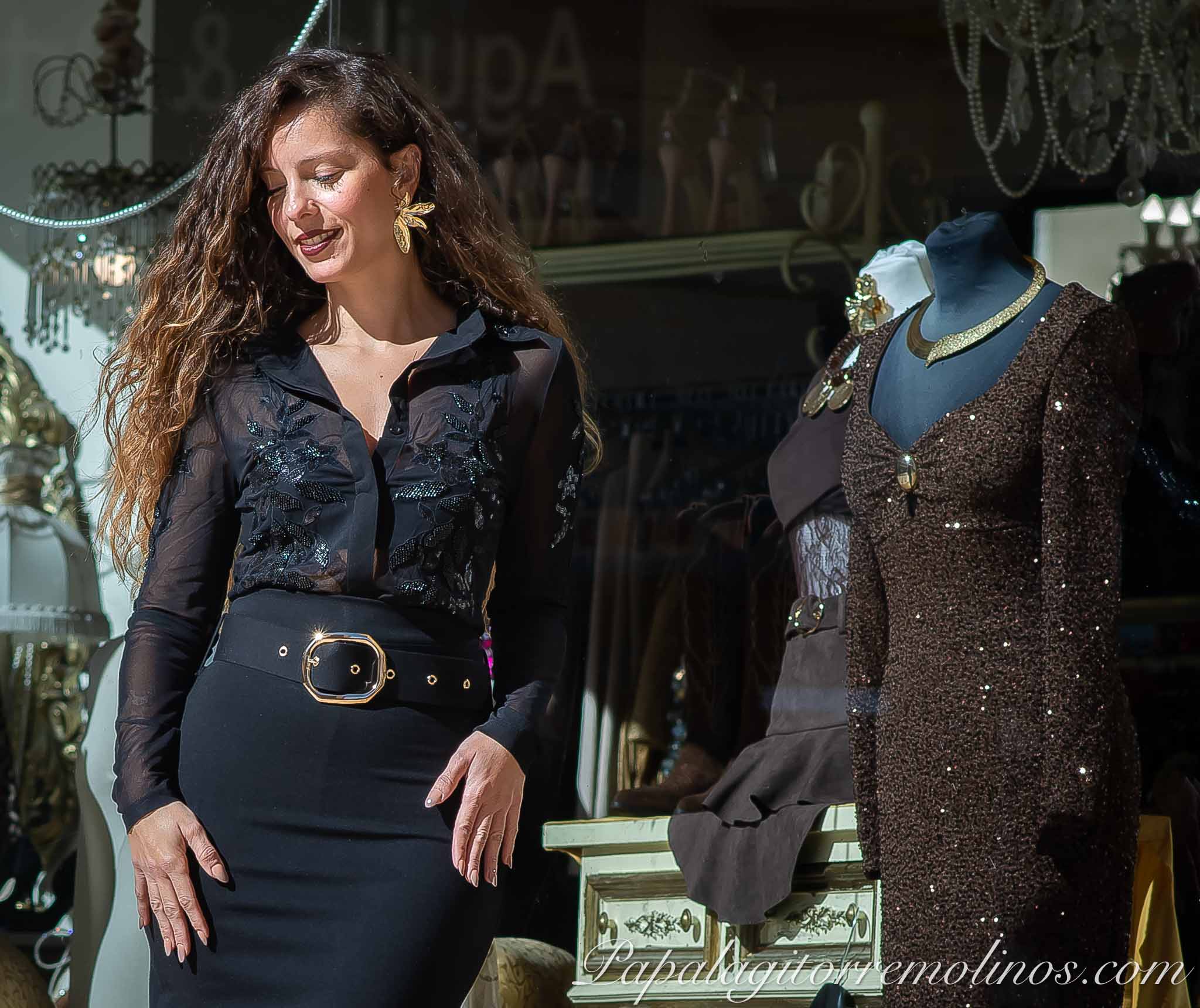 Preciosa camisa de pedrería, cuello de solapa y cierre de botones. Tejido de tul transparente.