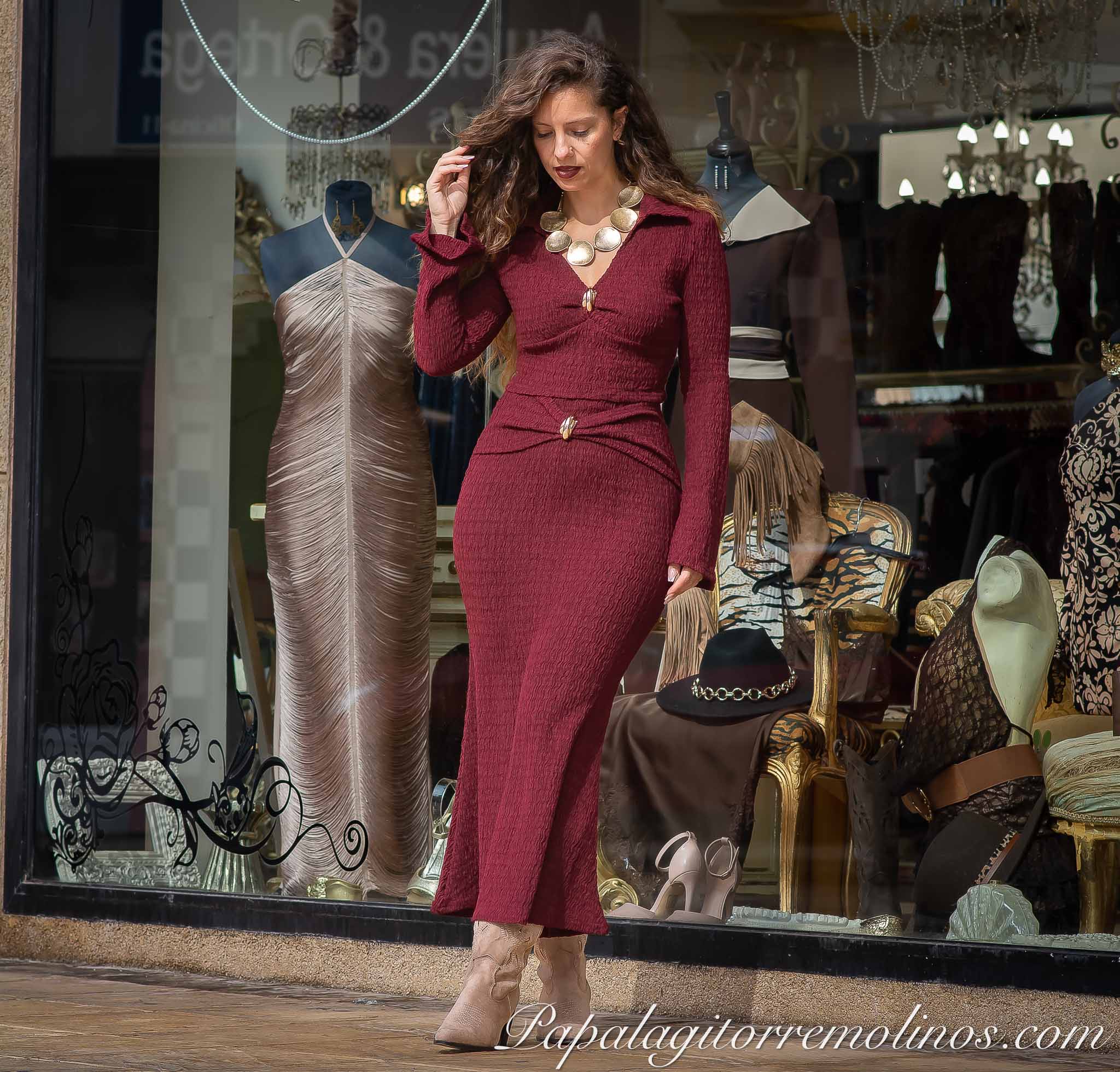 Precioso conjunto casual de dos piezas de punto. Top con escote de pico, cuello de solapa y manga larga. Falda larga ajustada con con nudo en la cintura.