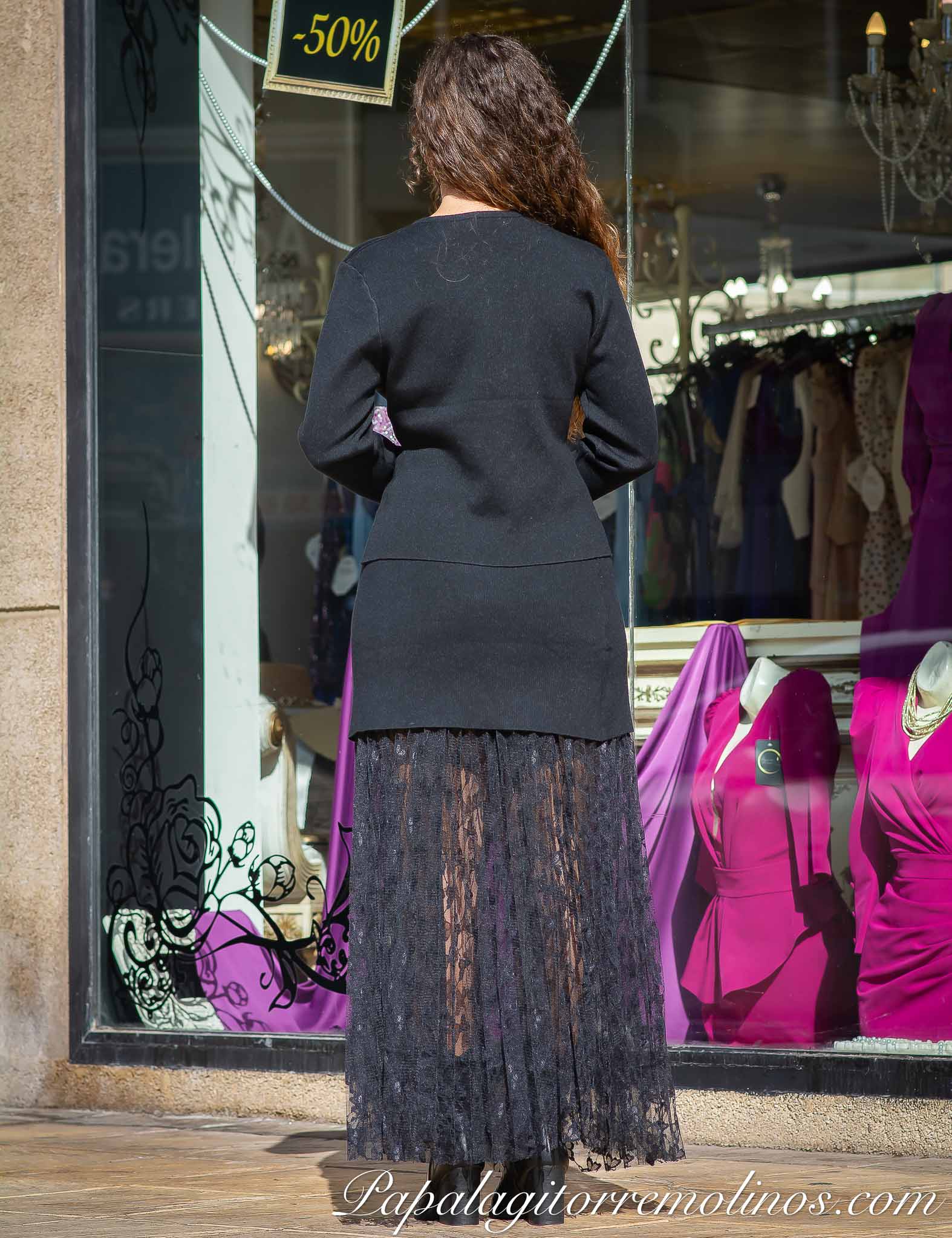 Precioso conjunto de dos piezas, rebeca de punto con escote de pico y manga larga, cierre de botones dorados. Falda larga combinada con encaje y dibujos de mariposa.