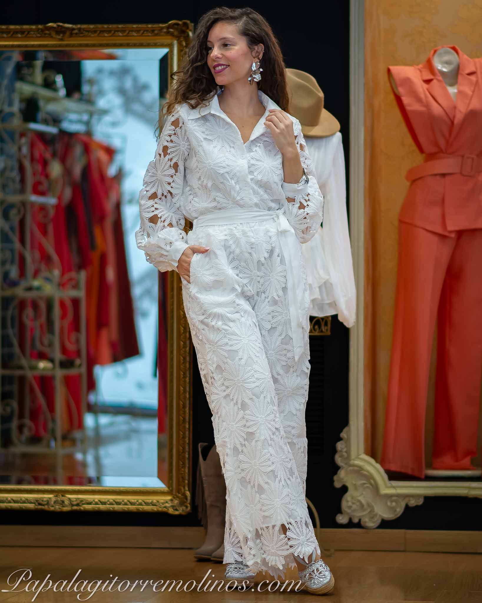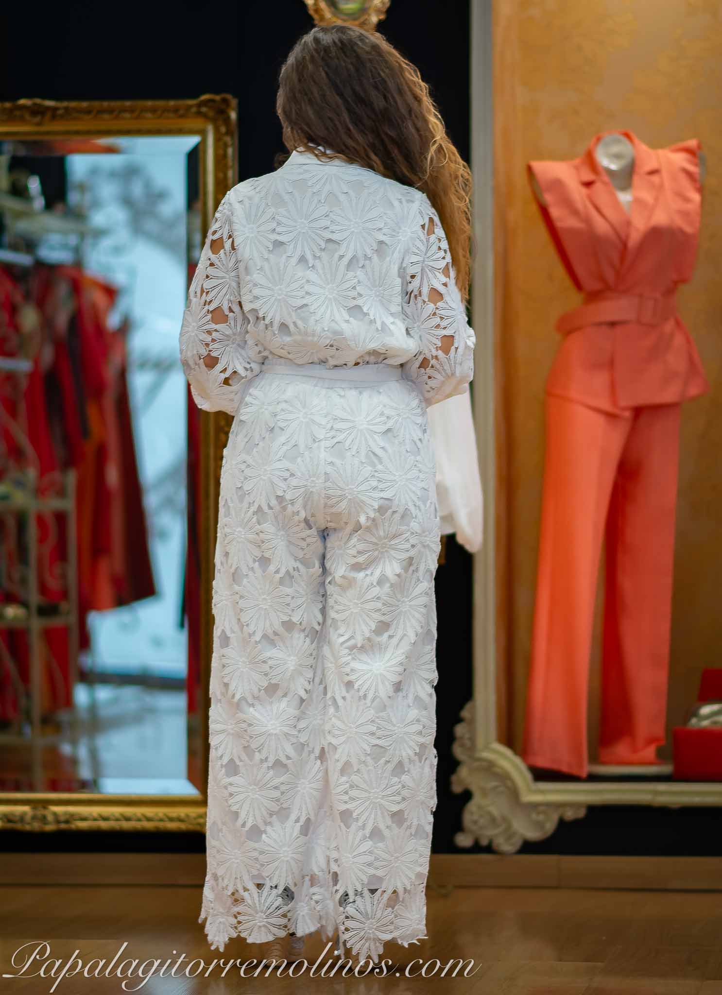 Precioso conjunto casual perforado, camisa abotonada de cuello solapa. Pantalón recto con cintura elástica.
