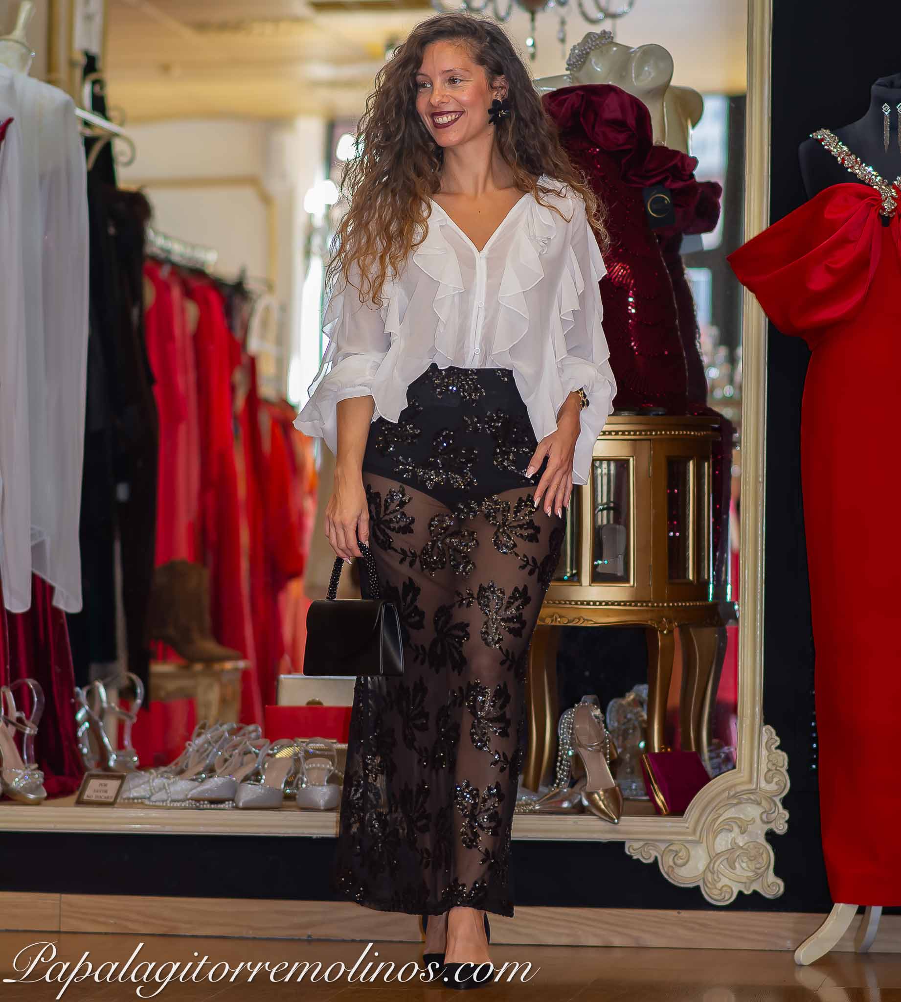 Preciosa falda larga, tejido de tul con dibujos de lentejuelas. Forro de pantalón corto estilo culotte, cintura elástica.