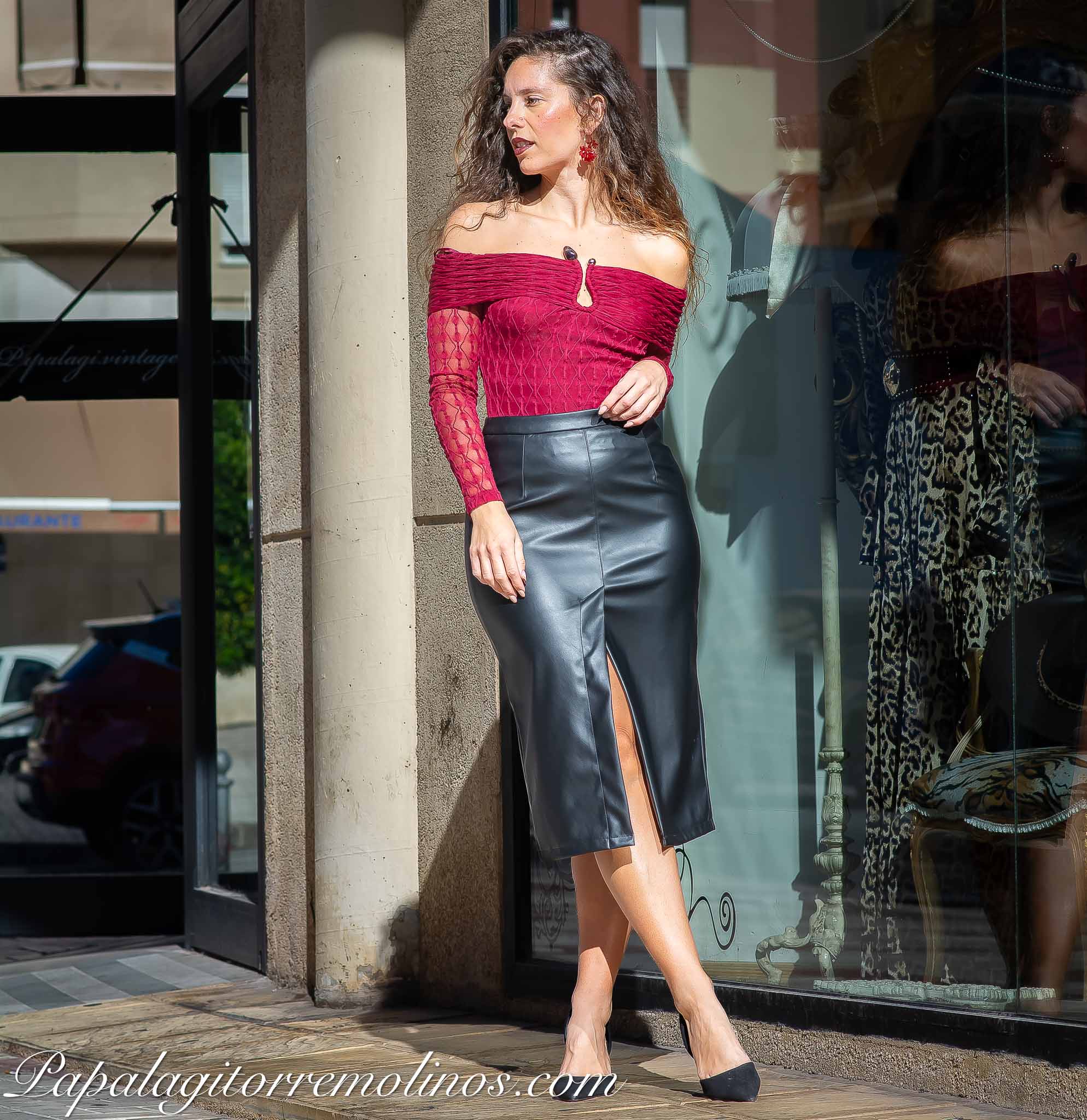 Preciosa falda midi de polipiel ajustada, con cierre de cremallera y abertura en la falda por delante.