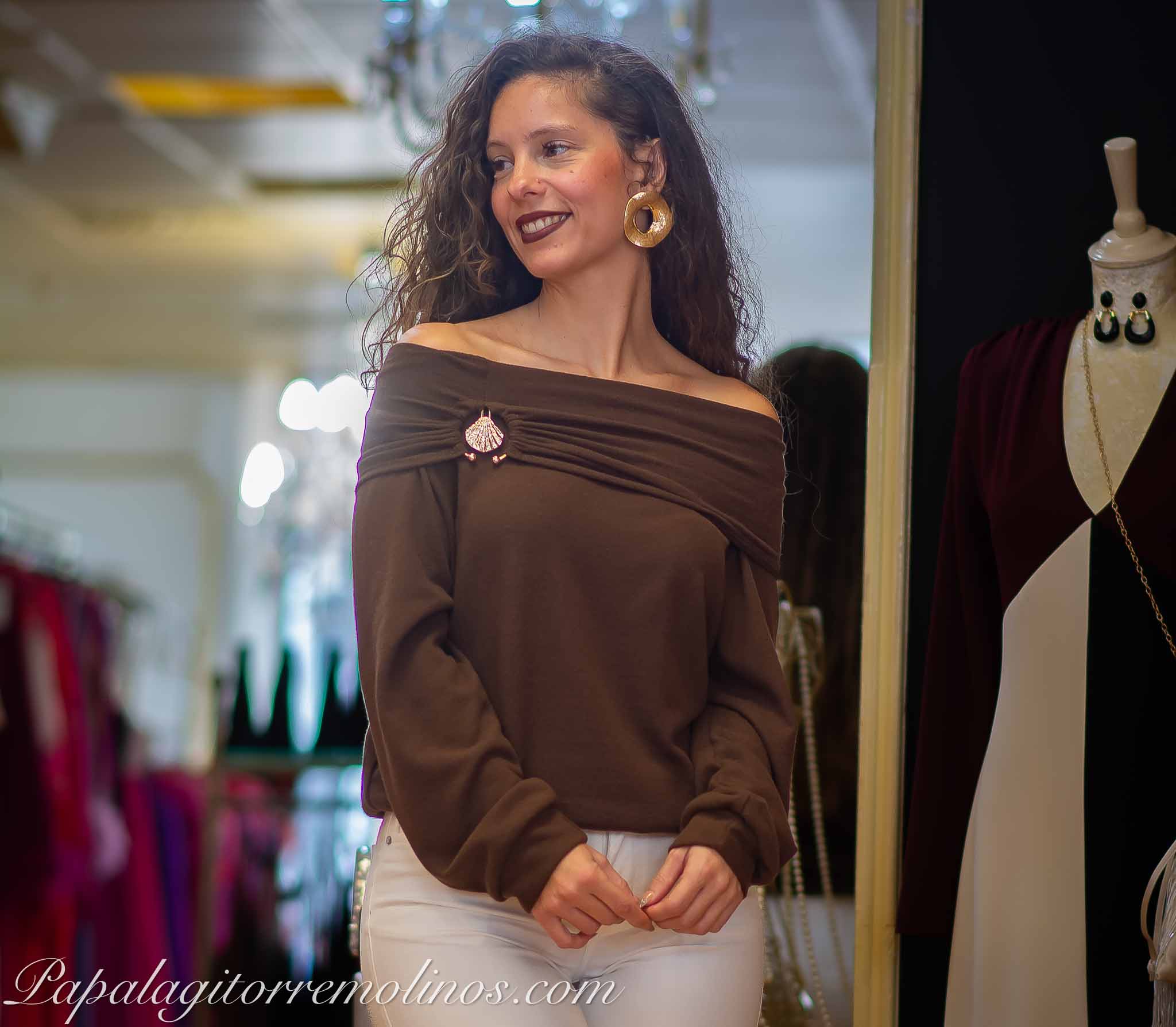 Precioso jersey escote de cuello barco con hombros caídos, argolla decorativa. Manga larga y cuerpo ablusonado.