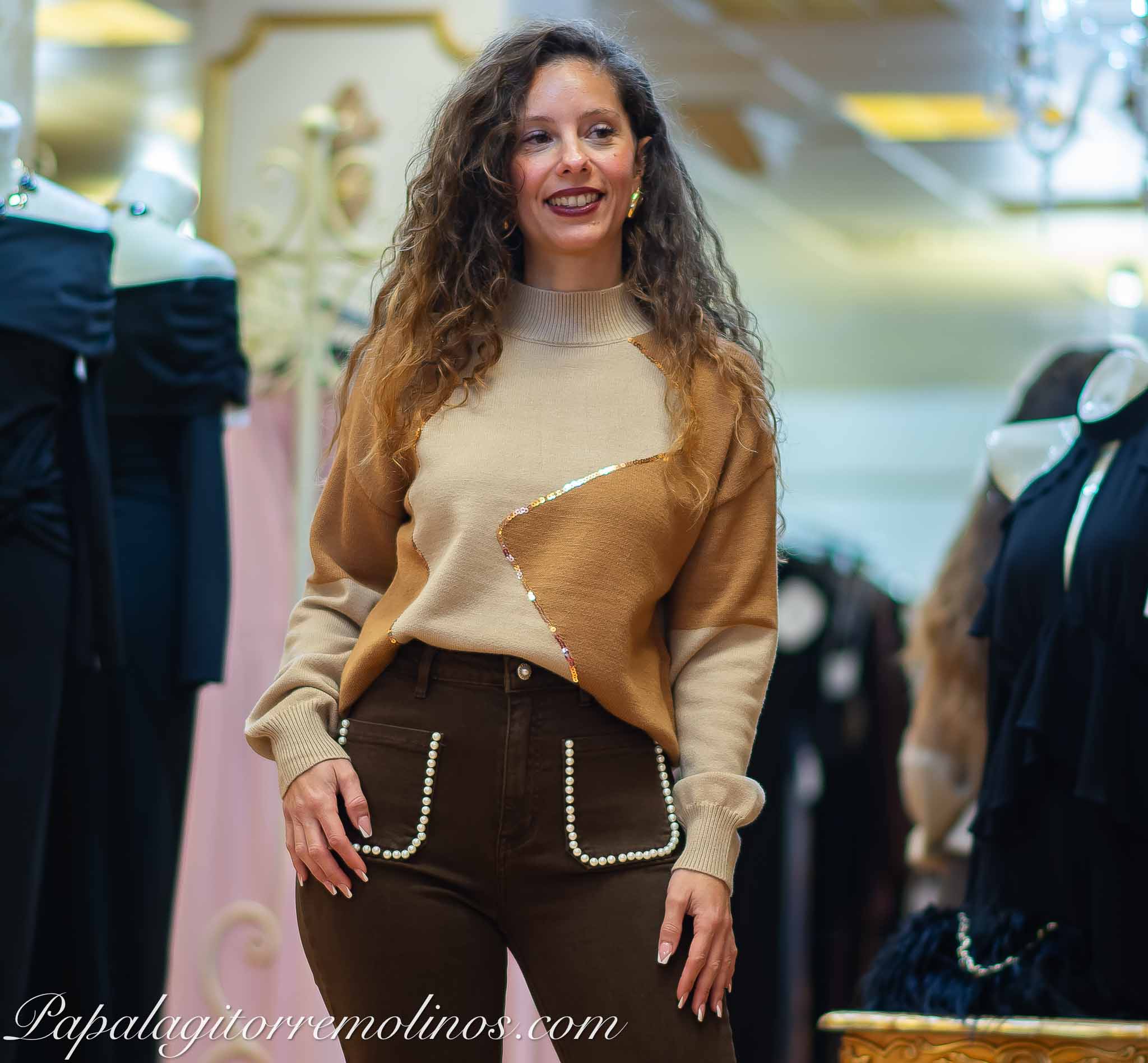 Precioso jersey estilo oversize, cuello alto y manga larga. Estampado bicolor decorado con líneas de lentejuelas.