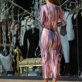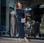 Precioso vestido largo, escote bardot de hombros descubiertos y manga larga. Cuerpo ajustado, tejido de tul elástico con brillo.
