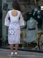 Precioso vestido midi , cuerpo de plumeti , manga acampanada y espalda con escote de trapecio . Falda tejido satinado .