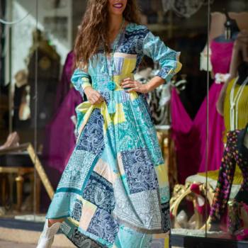 Precioso vestido largo, tejido muy fluido con detalles de hilo dorado . Escote cruzado , mangas acampanadas e incorpora fajín del mismo tejido .