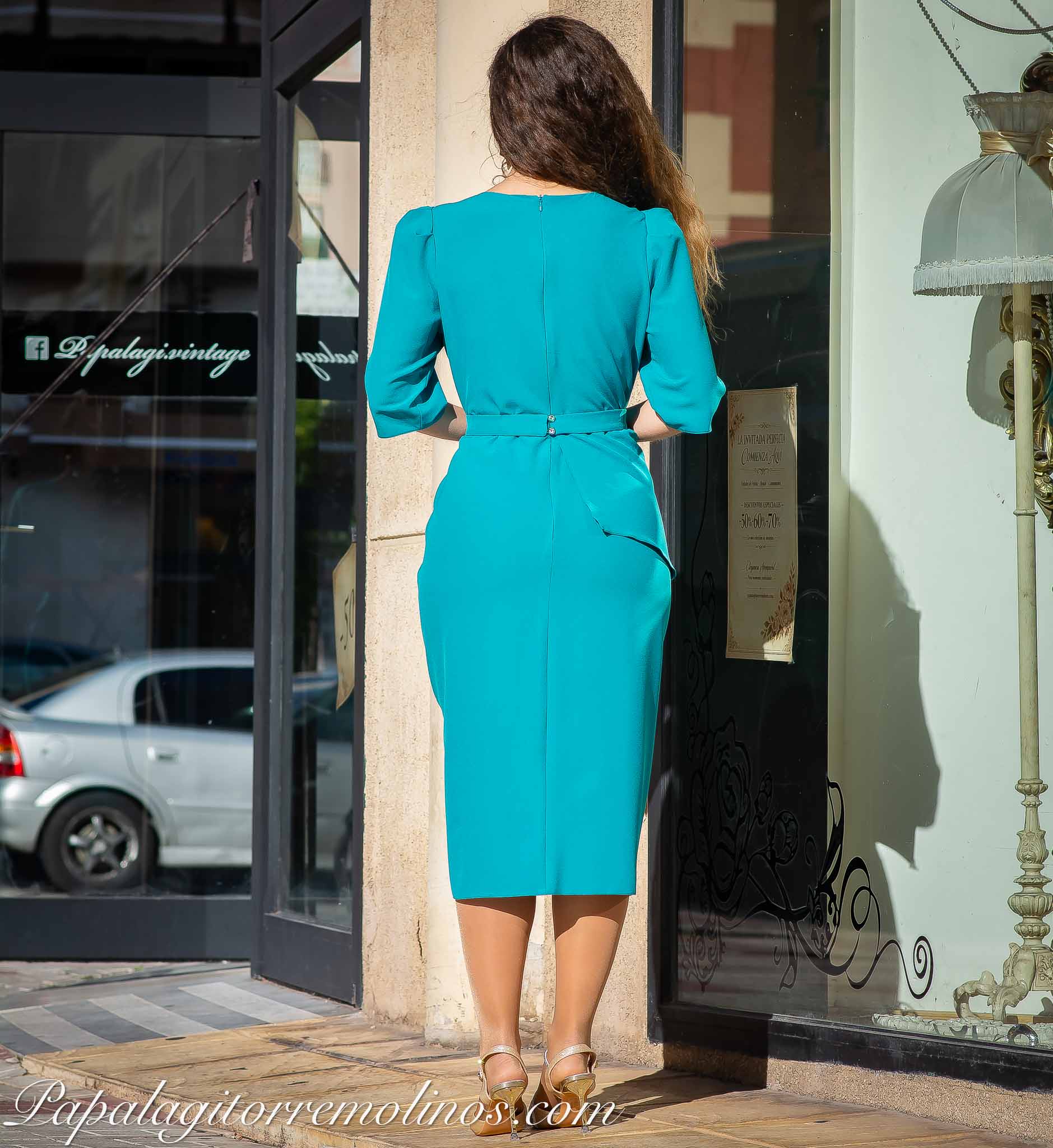 Precioso vestido midi, escote cruzado con mangas al codo. Falda con abertura lateral y cinturón con peplum.
