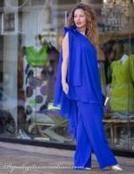 Precioso mono ,tejido de crepe, escote asimétrico , sobre falda y aplique de flor en hombro .