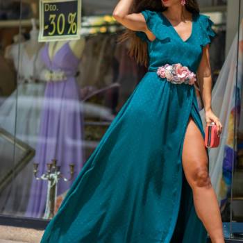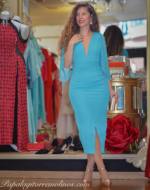 Precioso vestido midi, escote de pico con Tul. Mangas de gasa y falda fruncida hacia el lateral.