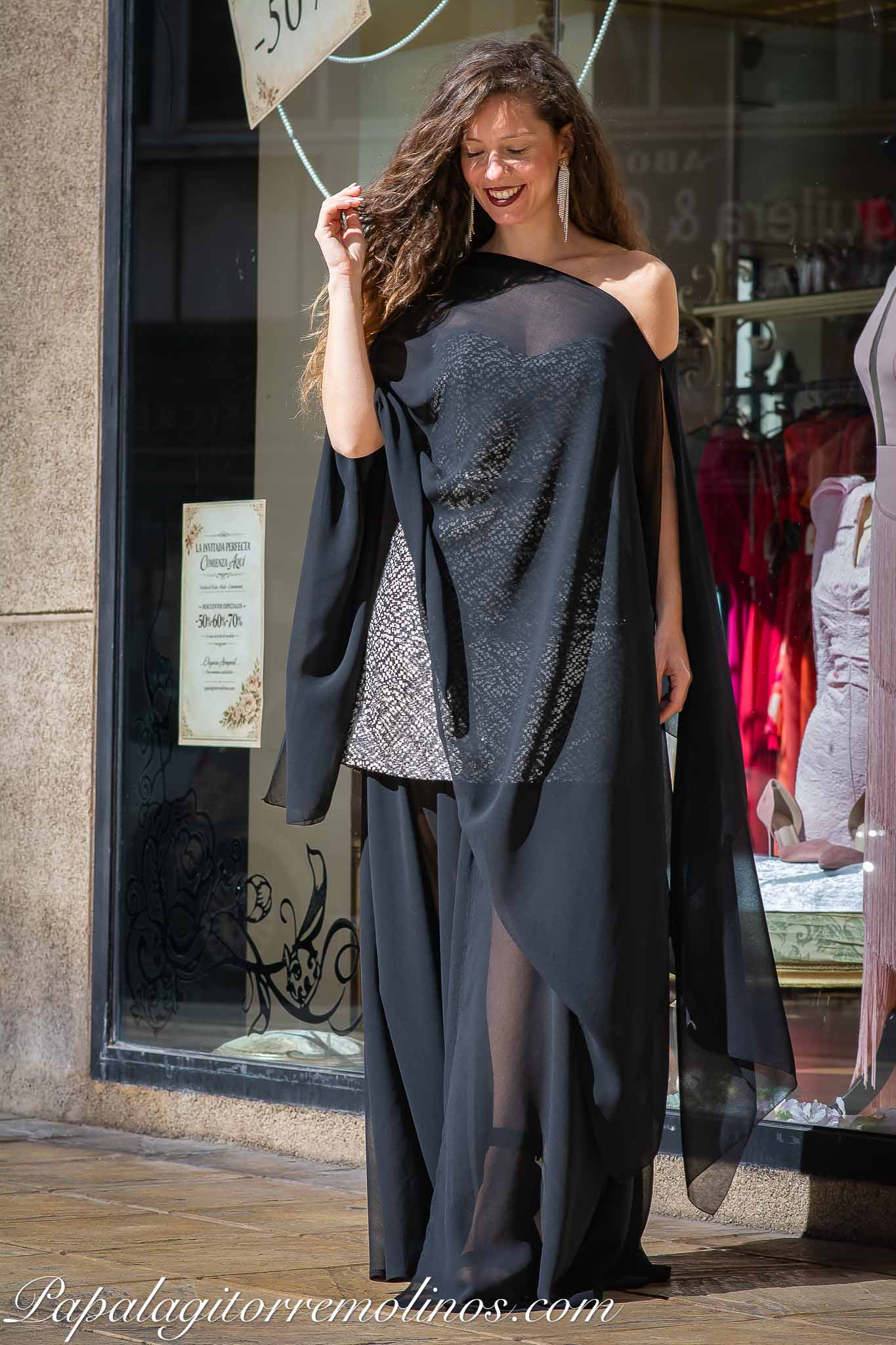 Precioso vestido largo combinado, escote palabra de honor con bajo de falda en gasa. Lleva capa de gasa a los hombros.