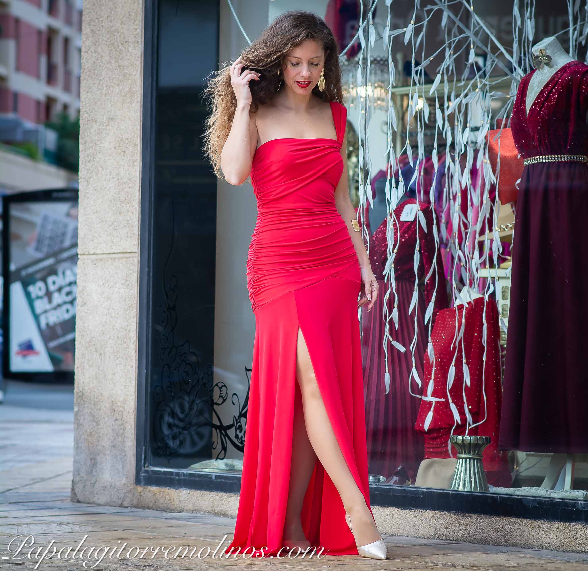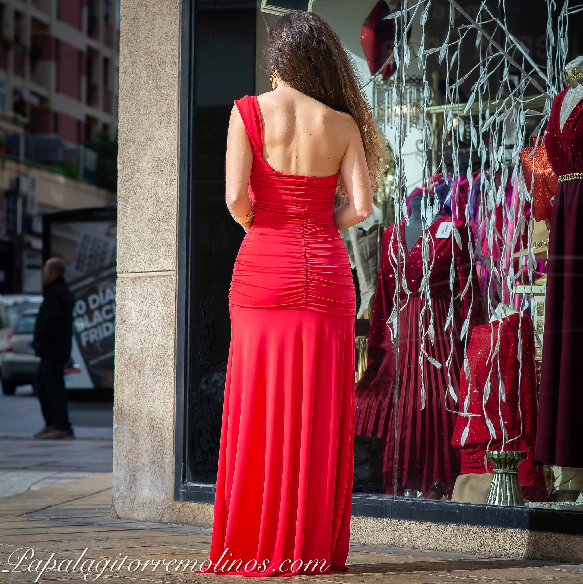 Precioso vestido largo en tejido punto seda. Escote recto palabra de honor con tirante al hombro. Cuerpo fruncido con abertura lateral en falda.