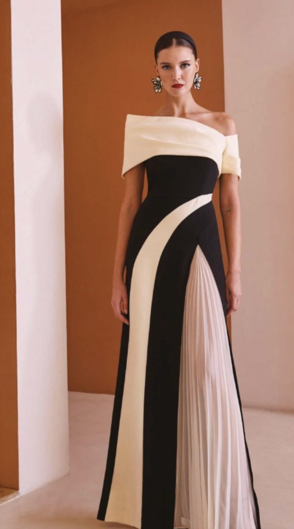 Precioso vestido largo bicolor, escote bardot asimétrico. Cuerpo ajustado con falda plisada combinada. Cierre de cremallera invisible.