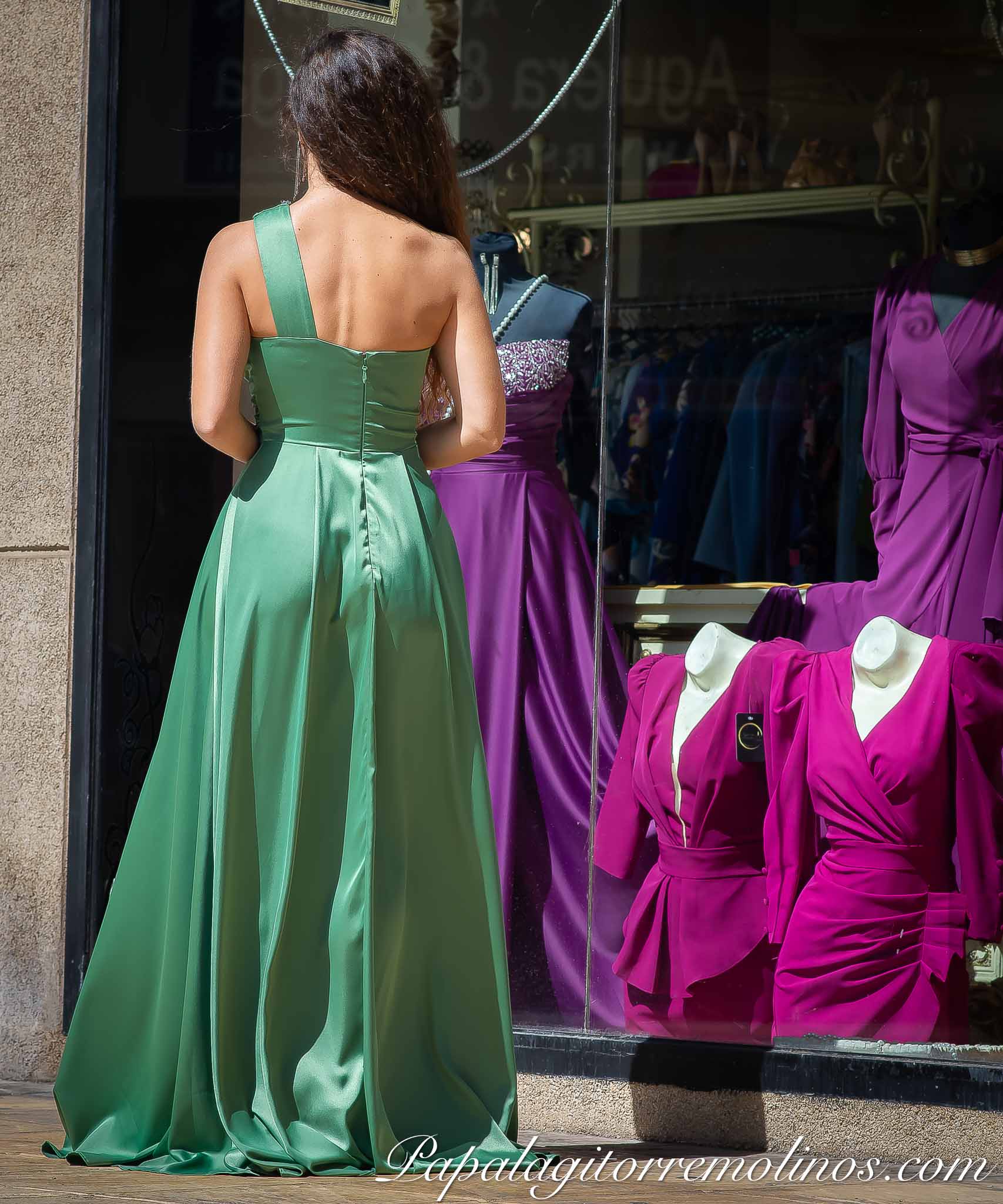 Precioso vestido largo, escote asimétrico con detalles de pedrería , tejido satinado y abertura en falda .
