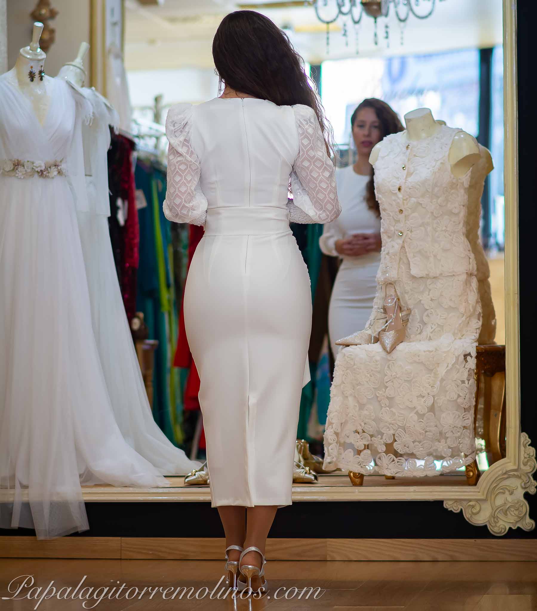 Precioso vestido midi, mangas de plumeti con figura. Cuerpo fruncido con lazada a la cintura.