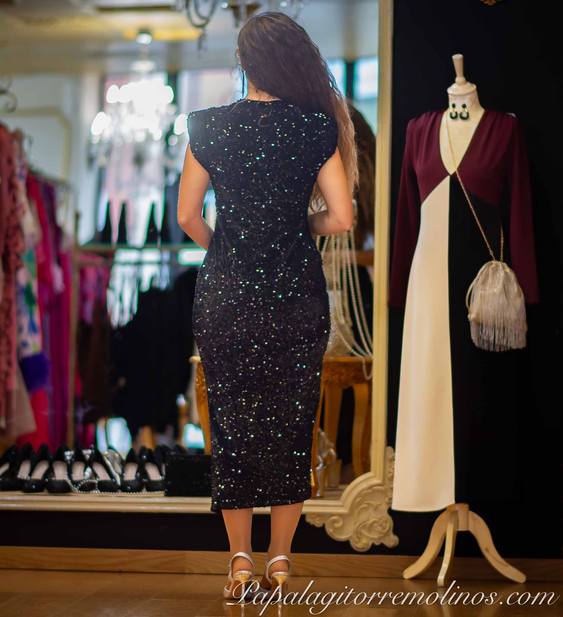 Precioso vestido midi , tejido de lentejuelas , escote acabado en nudo e incorpora hombreras .