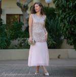 Precioso vestido midi combinado, mangas sisa y cuello redondo. Cuerpo de pedrería y falda plisada de gasa. Tejido elástico.