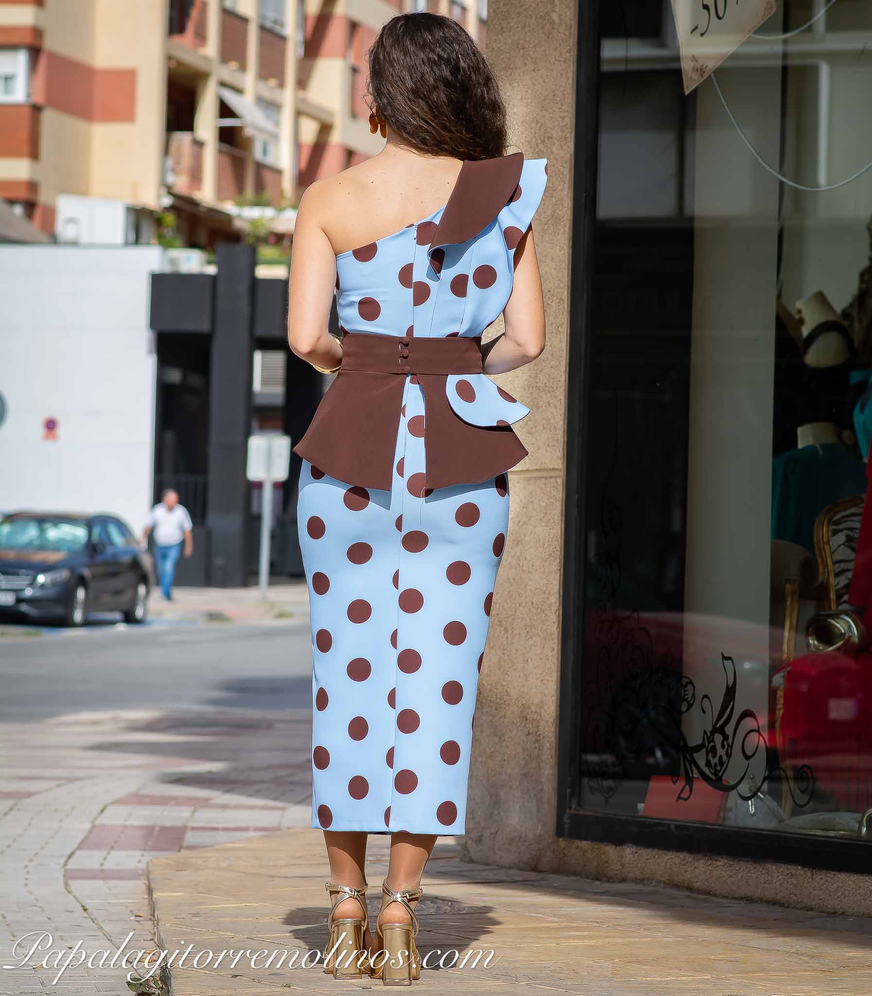 Vestido midi confeccionado en un tejido estampado de lunares grandes, ideal para lucir un look original, elegante y lleno de personalidad.