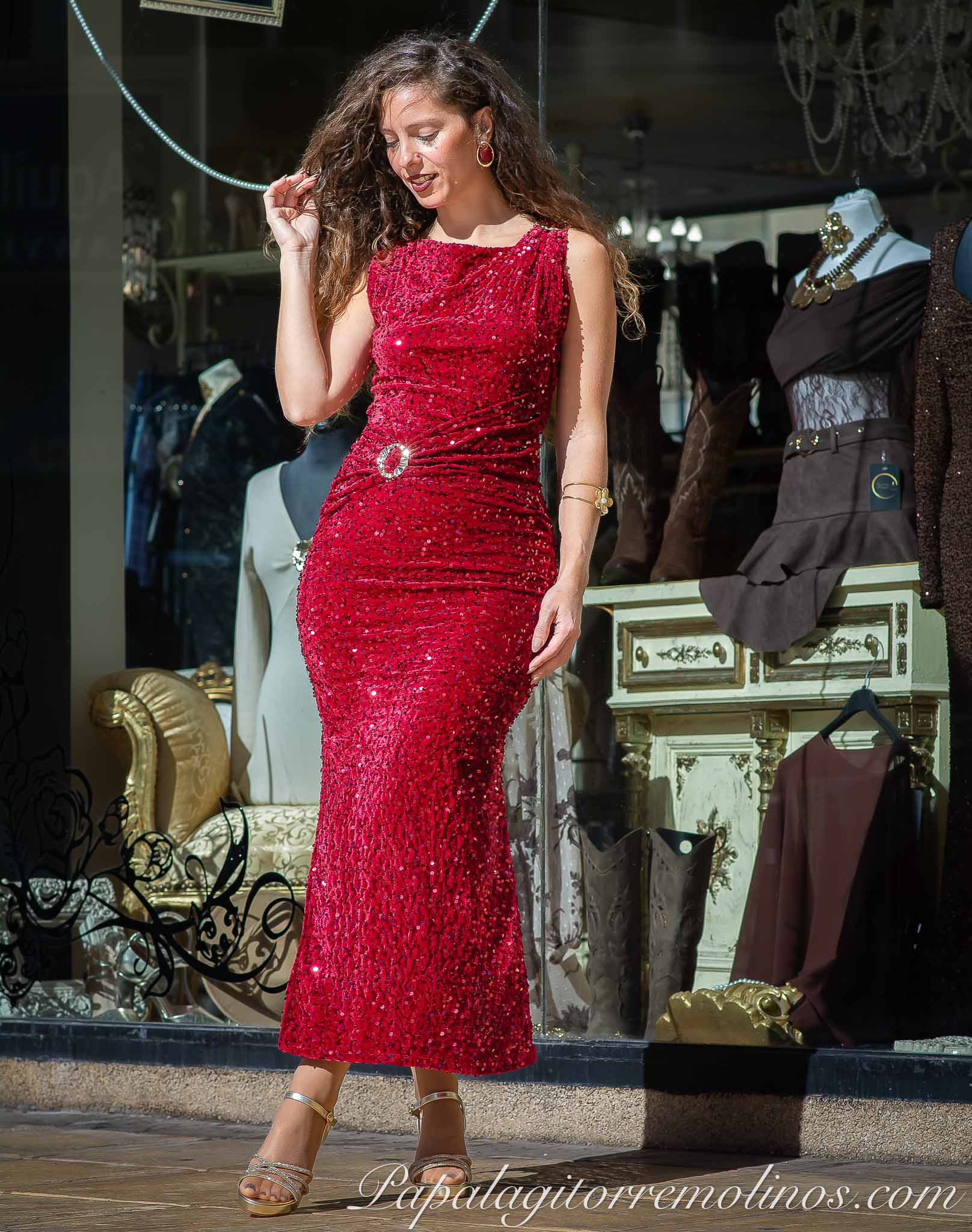 Precioso vestido midi, tejido de lentejuelas con escote redondo y mangas sisa. Sobretela cogida a la cintura con argolla y cierre de cremallera lateral.