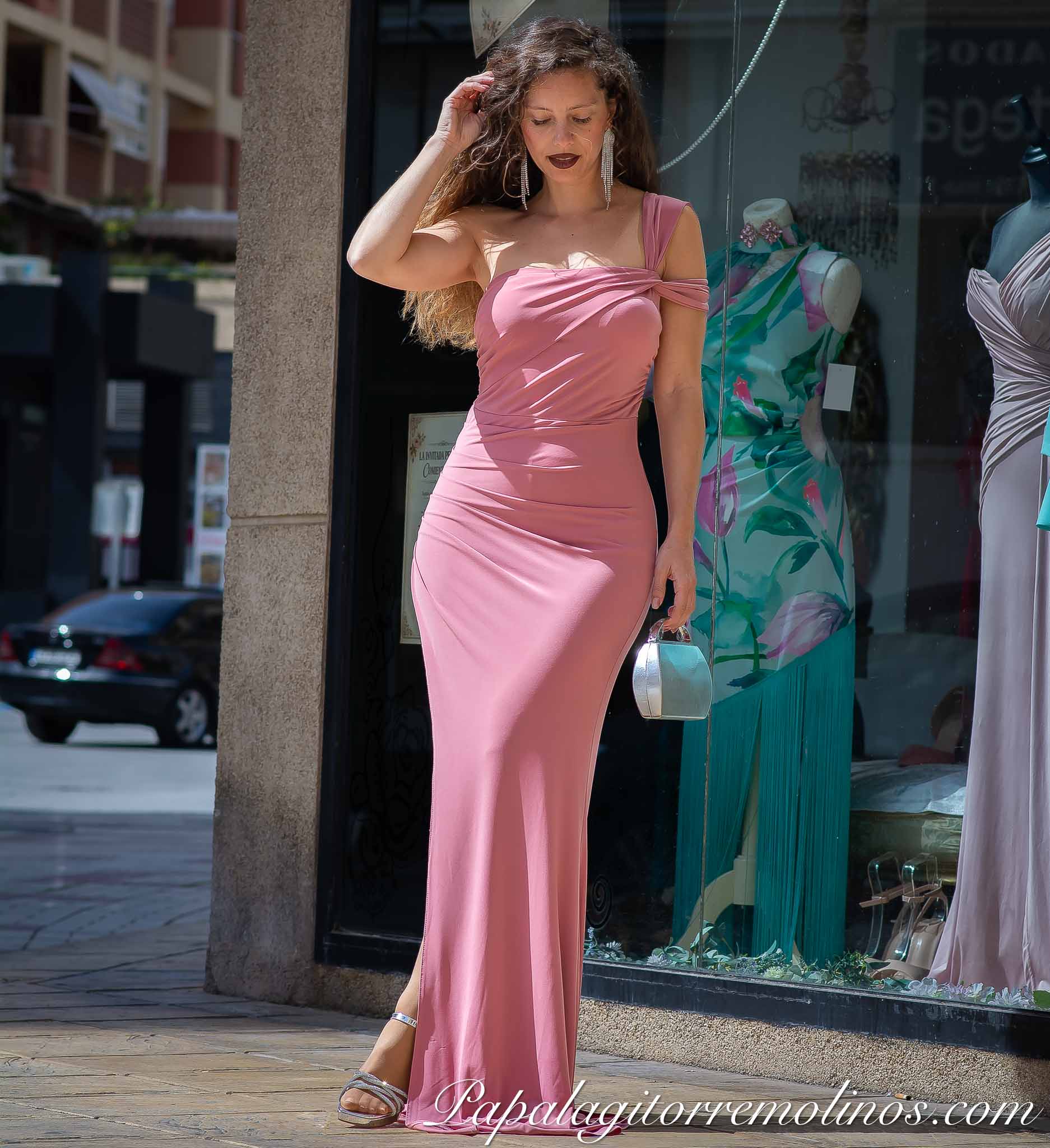 Vestido largo de silueta entallada en tono marrón chocolate y rosa maquillaje, dos opciones cromáticas que combinan calidez y delicadeza. El diseño destaca por su escote asimétrico con caída drapeada sobre los hombros, creando un efecto estructural que enmarca el escote con sutileza y modernidad.
