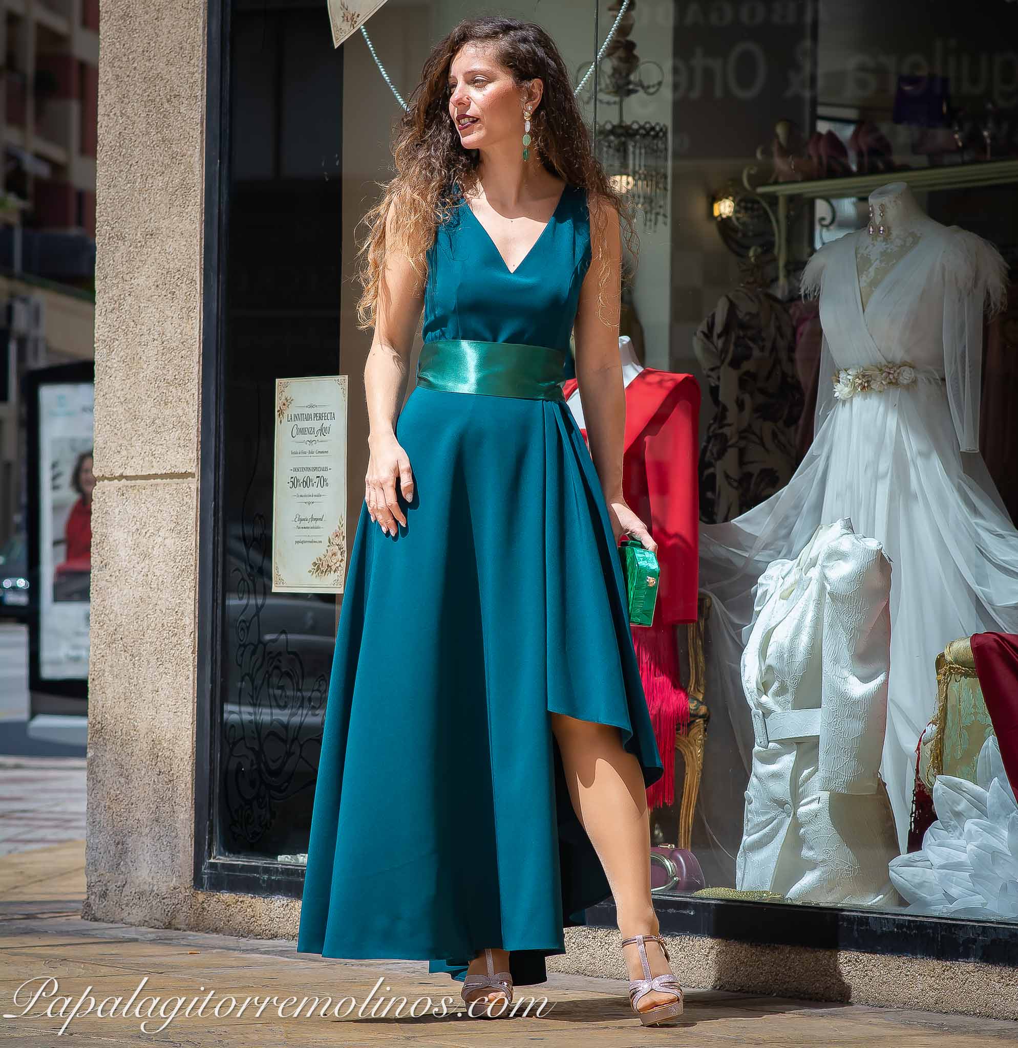El diseño presenta un favorecedor escote en pico tanto en la parte delantera como en la espalda, estilizando visualmente la silueta. La cintura se realza con una banda satinada ancha que define la figura y aporta un toque elegante.