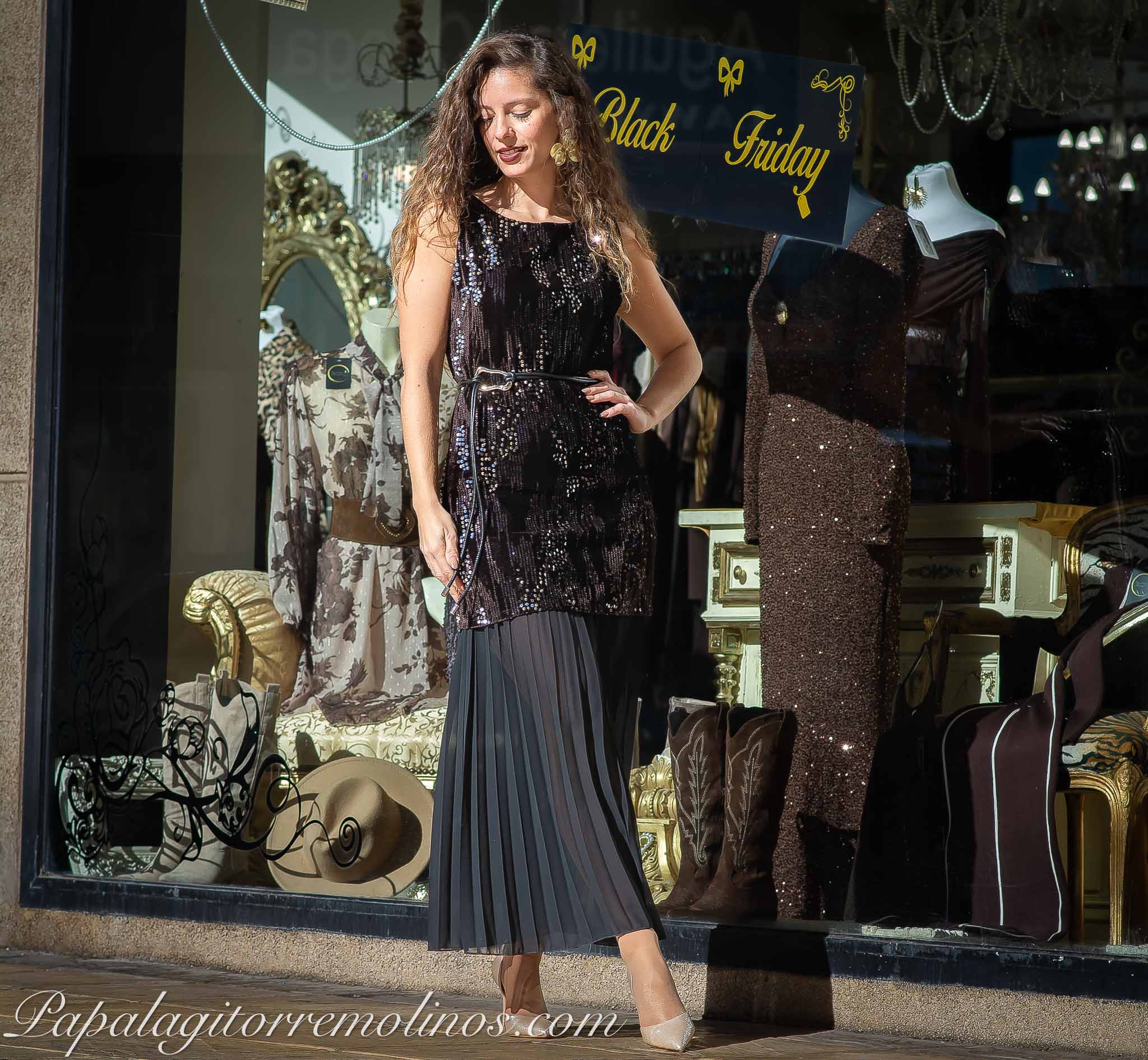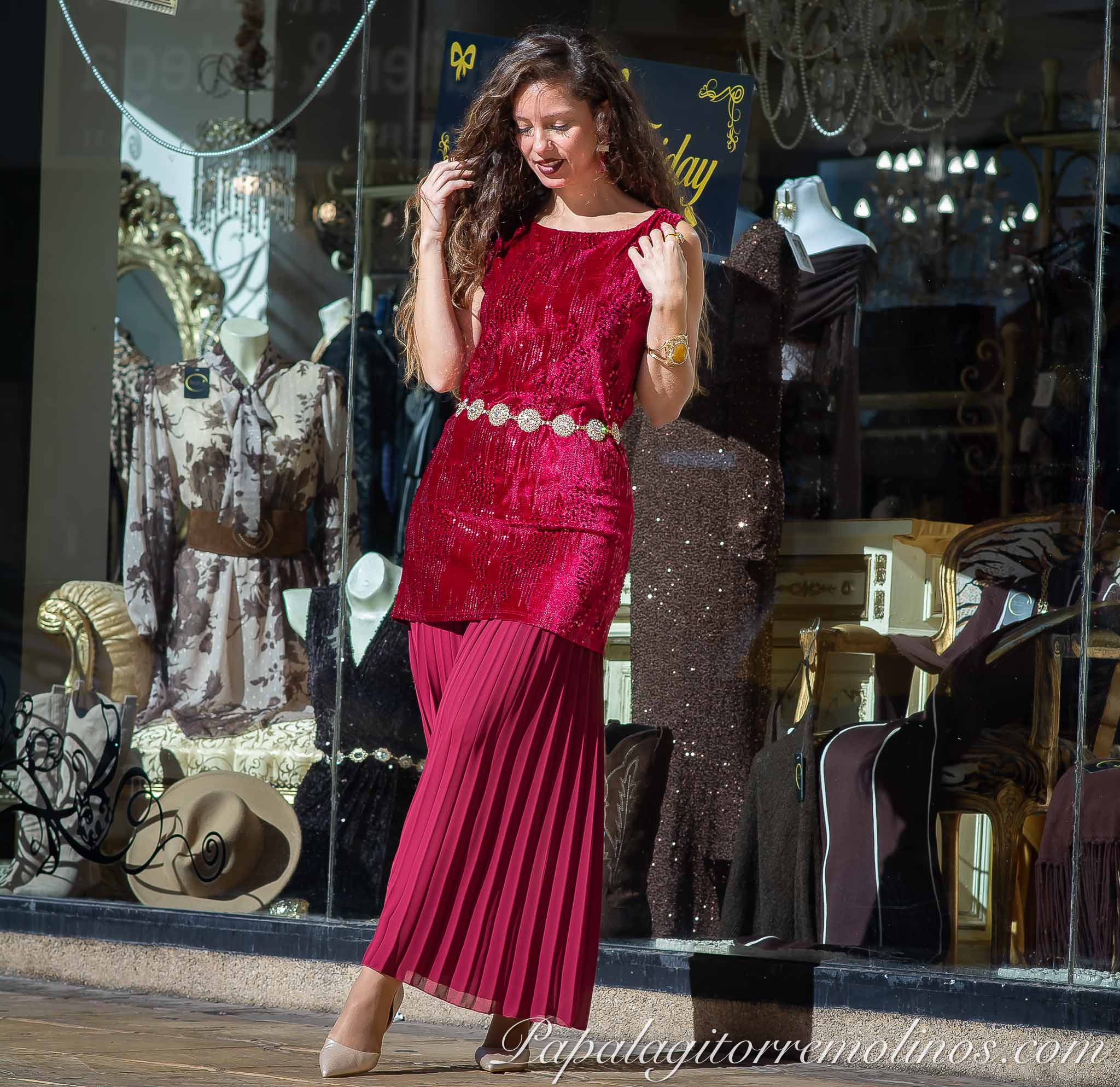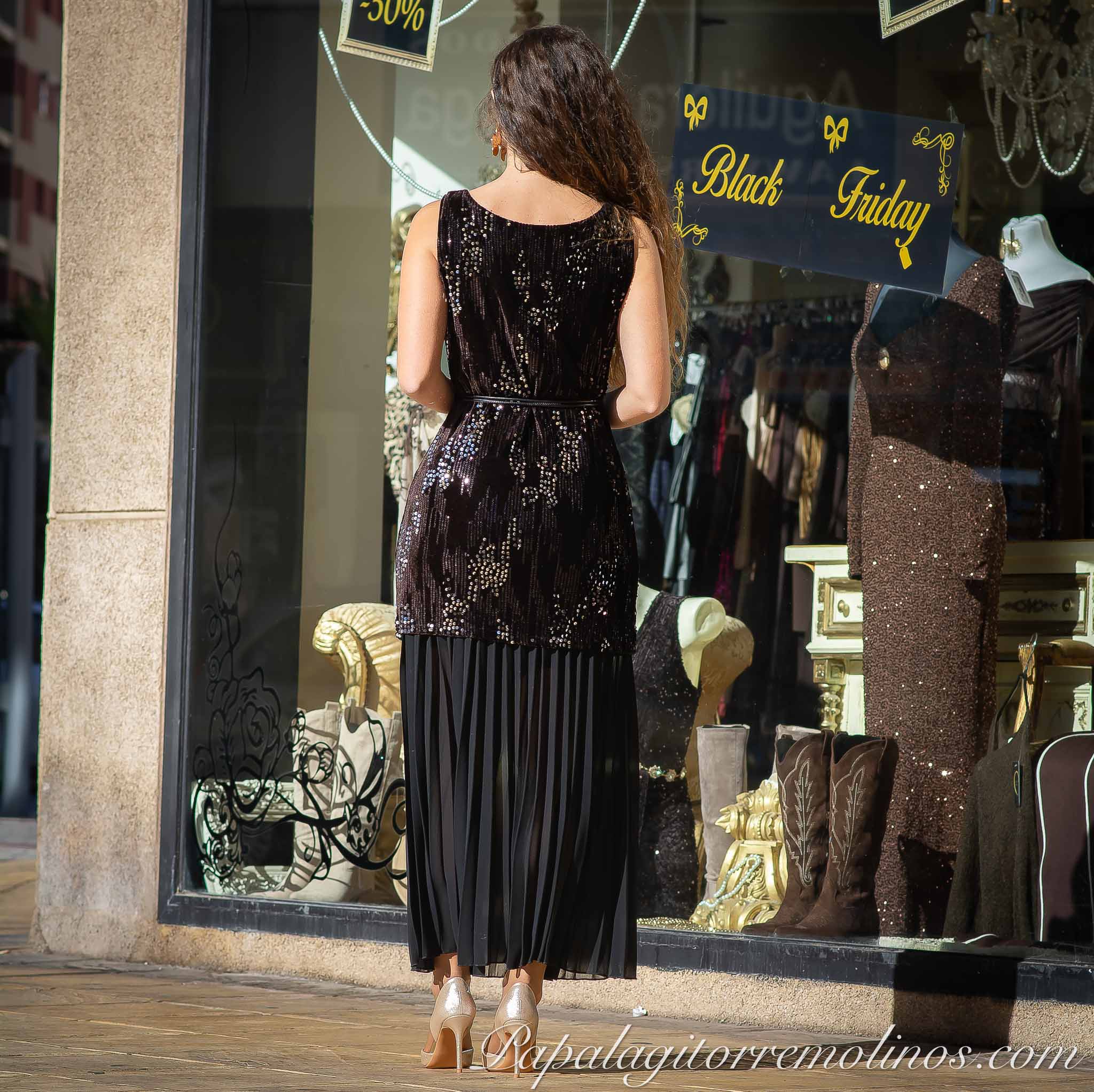 Precioso vestido largo combinado, cuello redondo y mangas . Cuerpo de lentejuelas falda plisada de gasa.