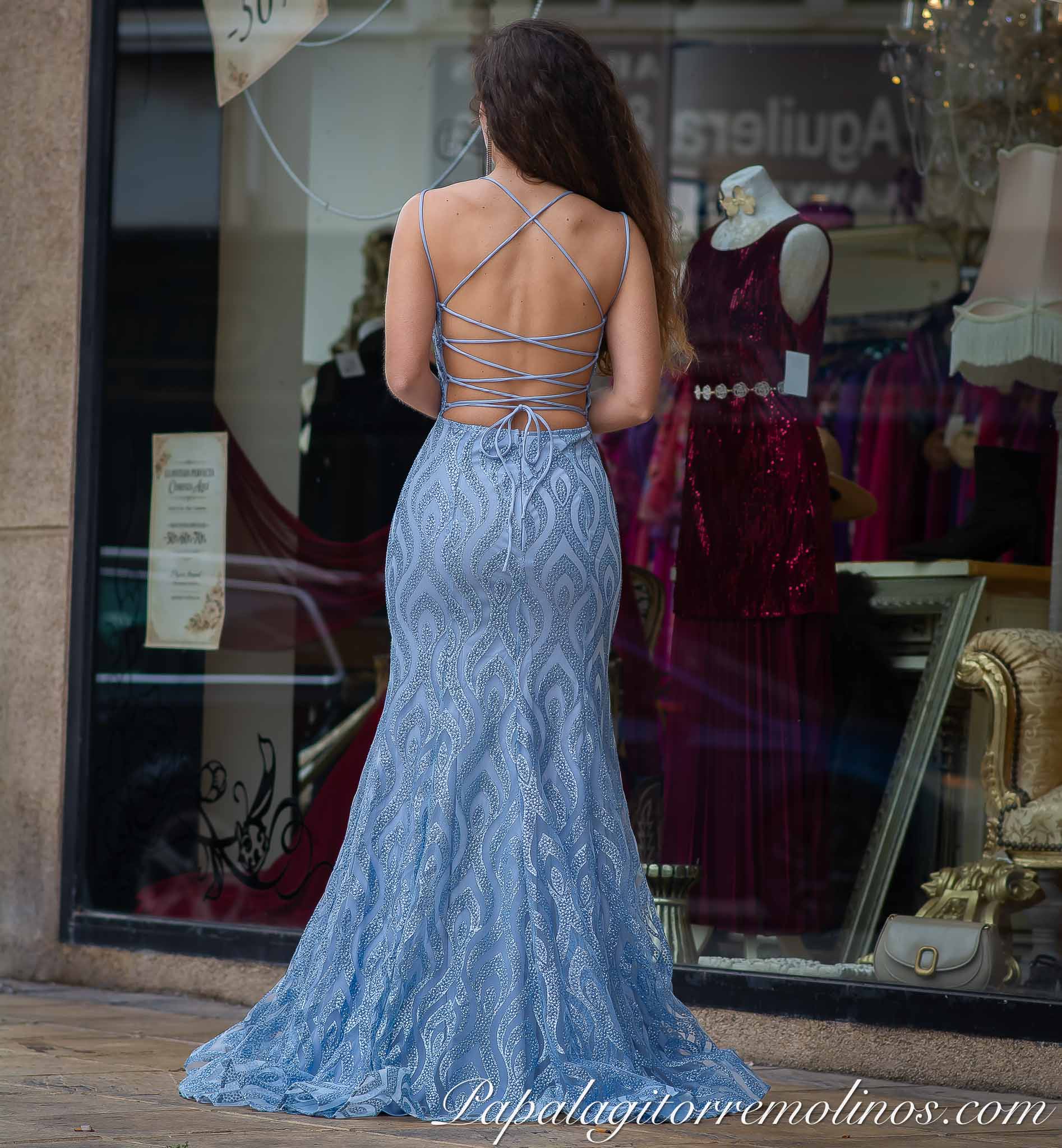 Precioso vestido largo ,corte de sirena , tejido de lentejuelas y purpurina , espalda descubierta cruzada y anudada.Escote infinito . Incorpora cascos .