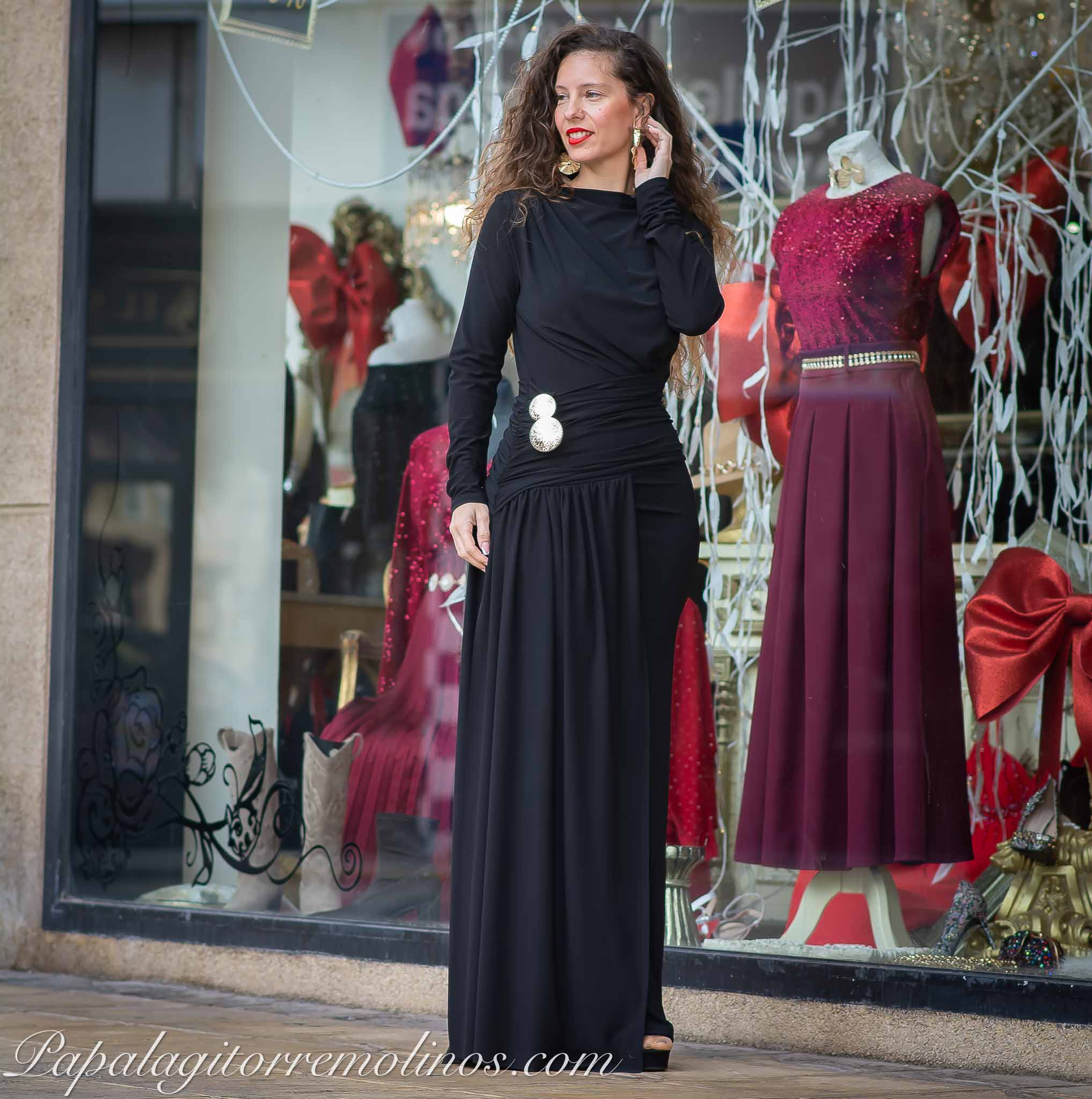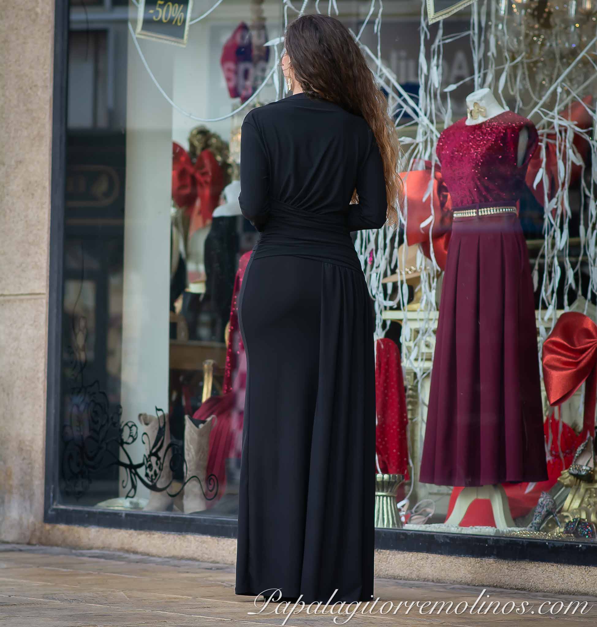 Precioso vestido largo con cuello a la caja y manga larga. Tejido punto seda, cintura fruncida decorado con bisutería, falda larga de vuelo.