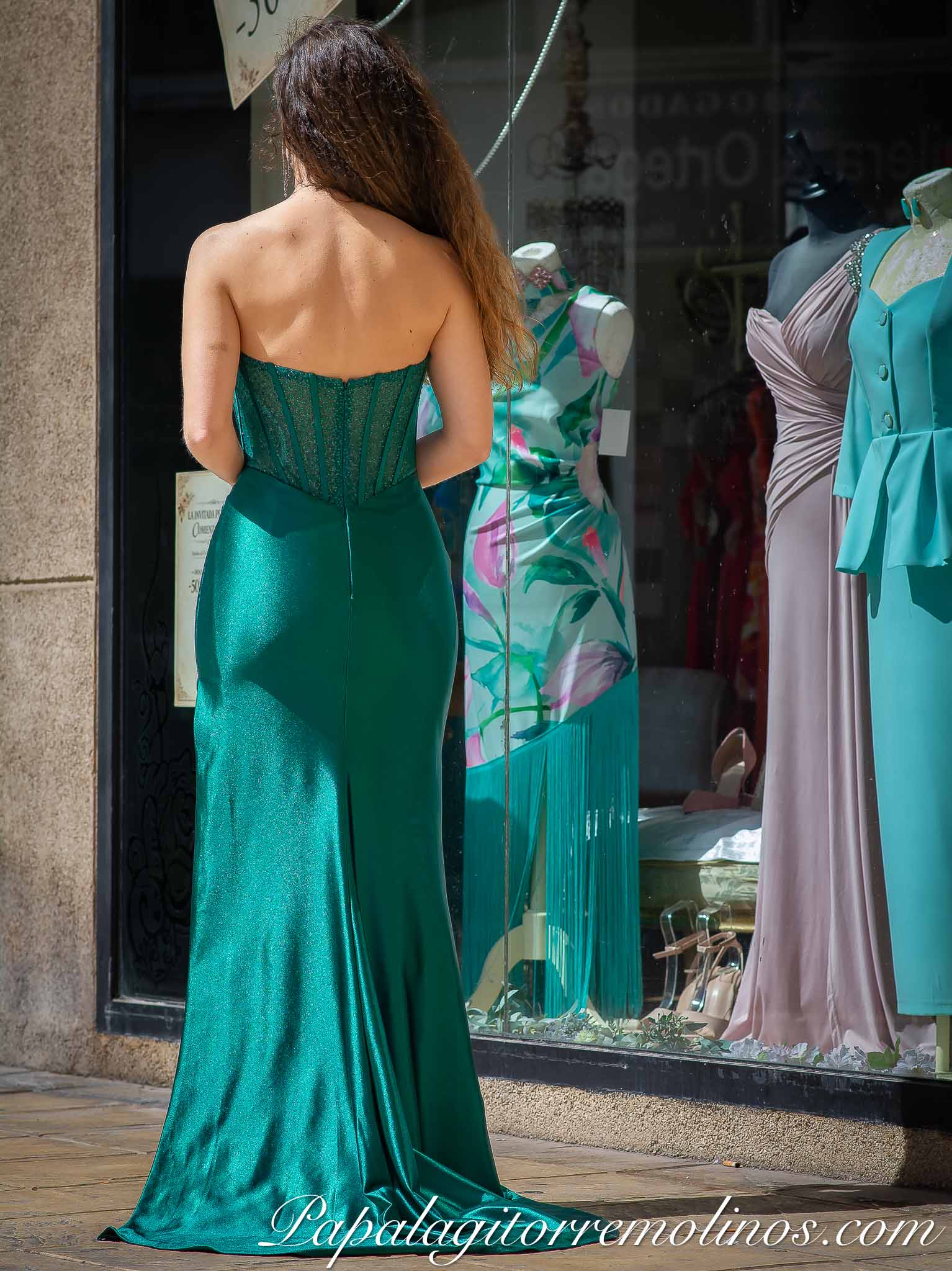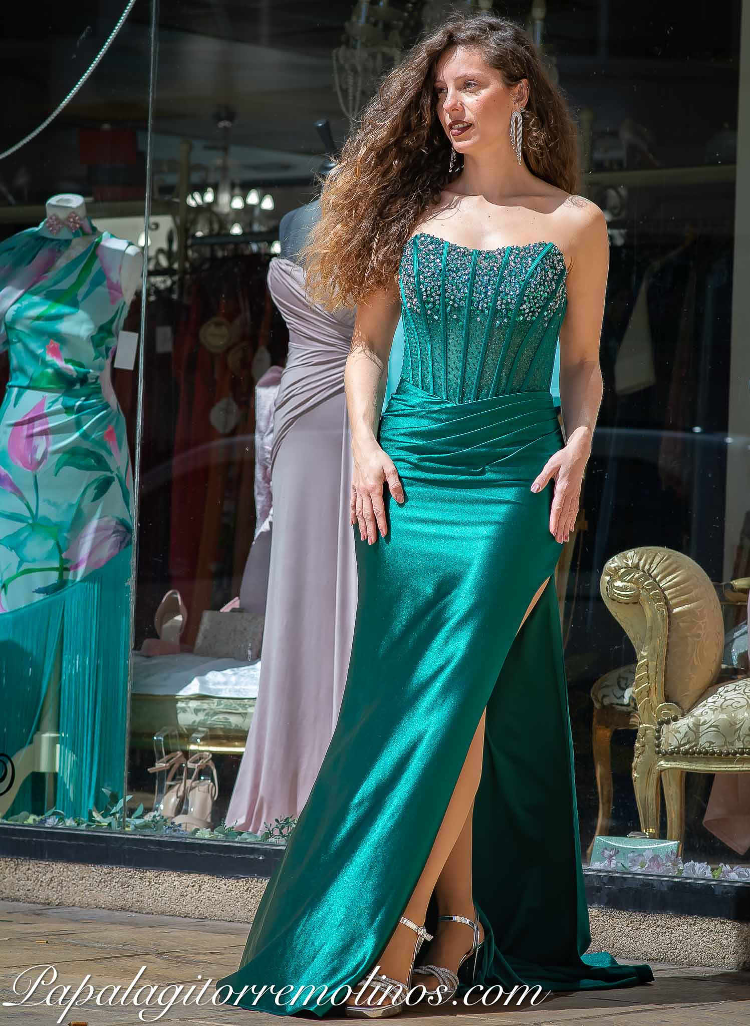 Precioso y elegante vestido, escote palabra de honor con pedrería. Gracias a su cuerpo en corset acentúa la silueta femenina, drapeado en la cintura y falda ajustada en corte de sirena con abertura lateral.