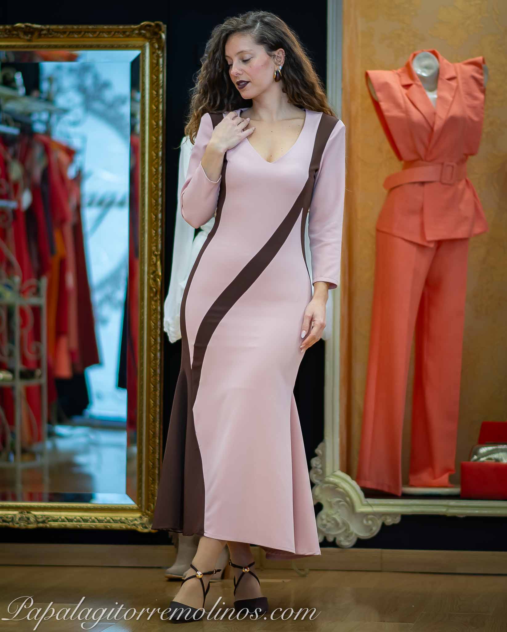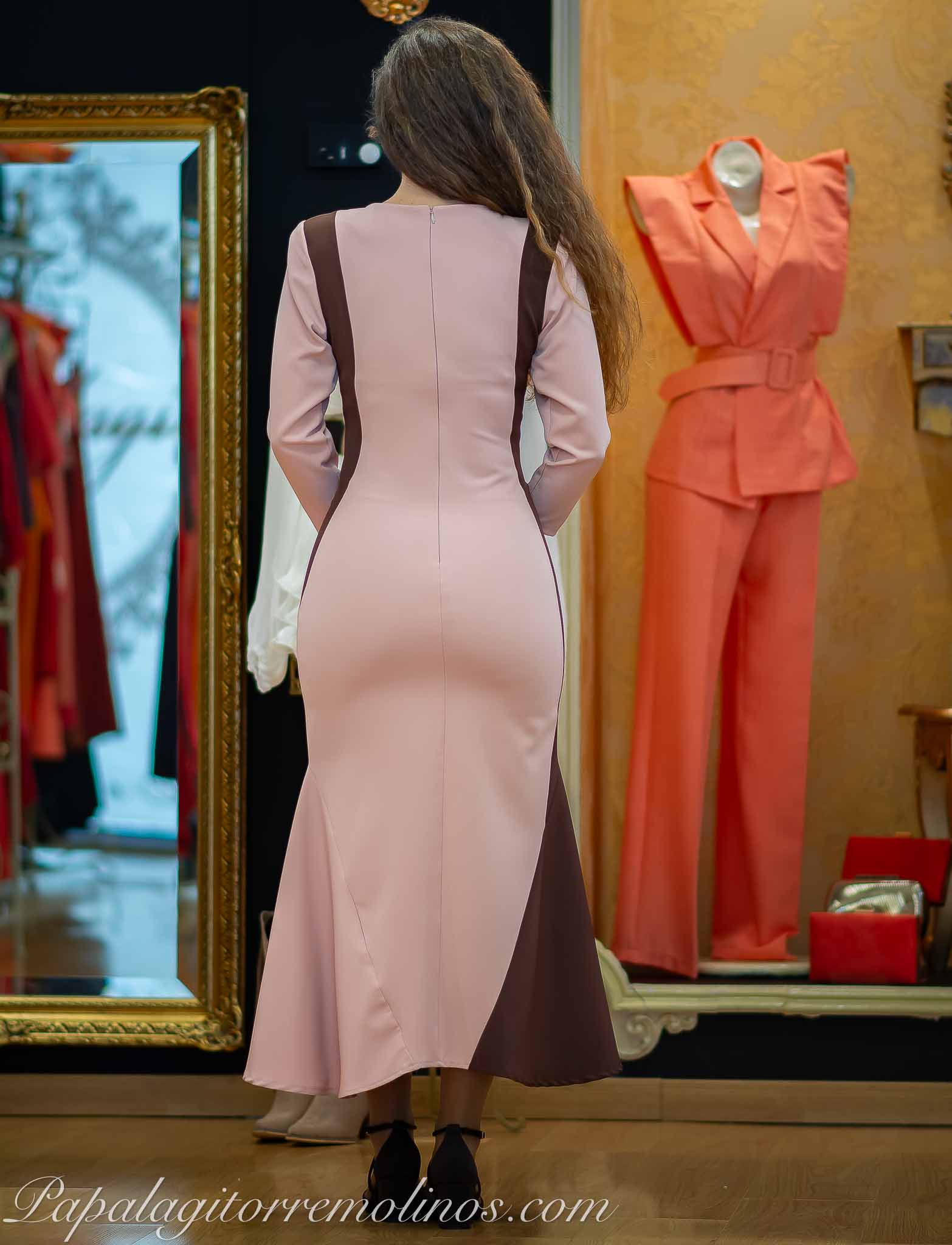 Precioso vestido midi , ajustado , elástico , bicolor , escote de pico y volante en falda . Cierre de cremallera invisible .