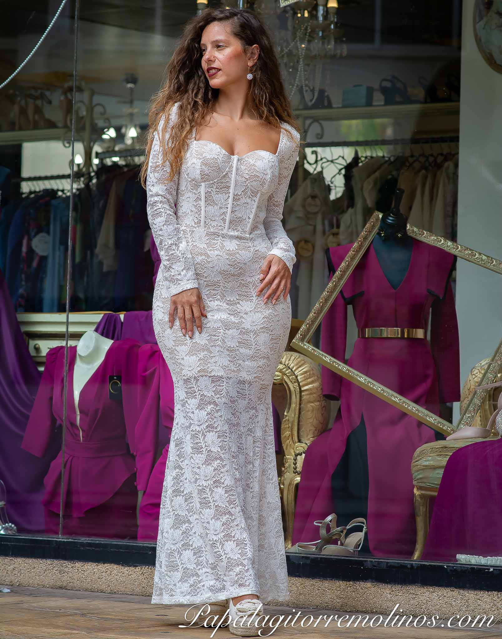 Precioso vestido largo, tejido de blonda. Manga larga con escote de corazón (lleva casco). Cierre de cremallera invisible a la espalda. Forro corto en color nude.