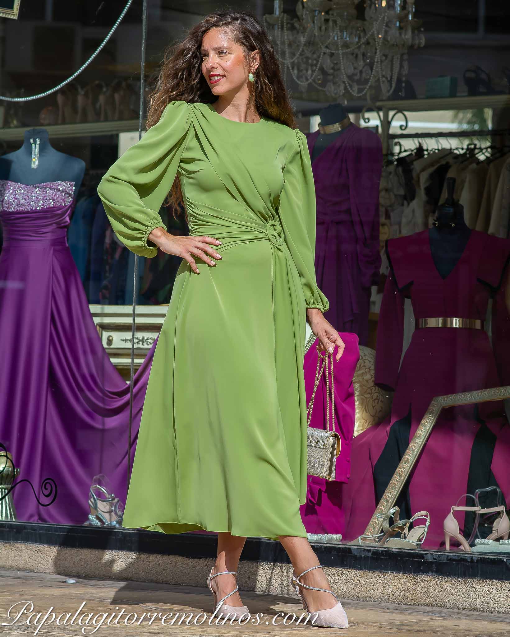 Precioso vestido midi confeccionado en tejido de crep fluido. Detalle de hebilla forrada con banda fruncida. Mangas abullonadas con hombrera interiores. Lleva forro interior y cremallera en espalda.