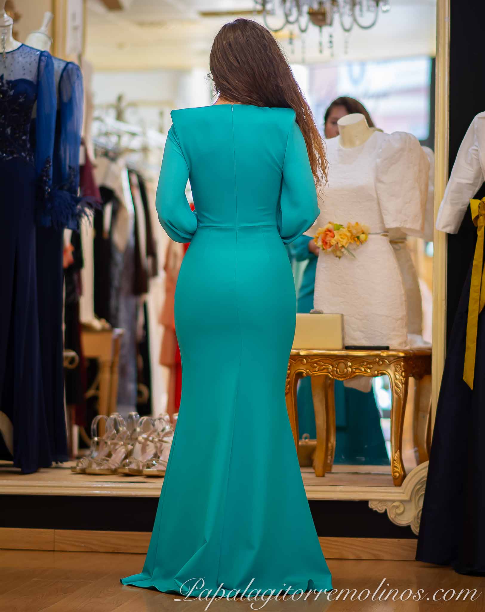 Precioso vestido midi , escote en V con hombreras y manga larga, drapeado en cintura con anilla y gasa caída , abertura en falda.