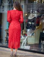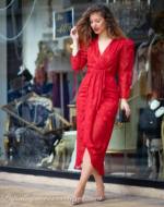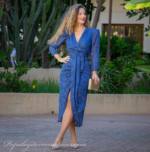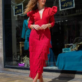Precioso vestido midi de escote cruzado, manga francesa, lleva hombreras. Falda con abertura estilo tulipán, cierre de cremallera invisible a la espalda.