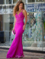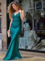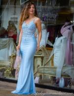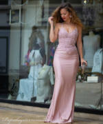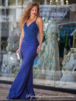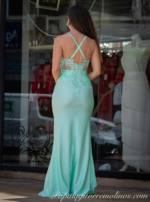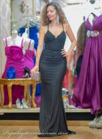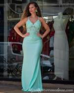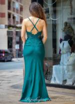 Precioso vestido largo, ajustado, cuerpo de encaje y pedrería, tirante fino. Espalda descubierta y drapeado en cintura