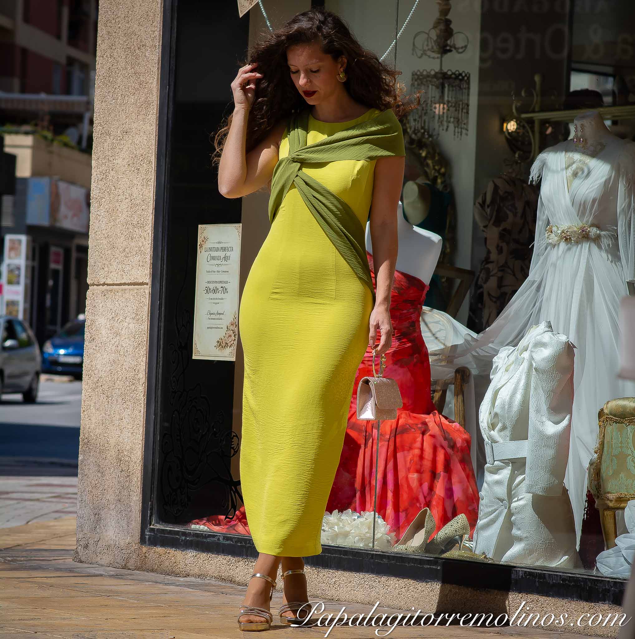Vestido midi de silueta entallada en un vibrante tono amarillo lima, confeccionado en un tejido con textura ligera que se adapta al cuerpo realzando la figura de forma elegante y sofisticada.