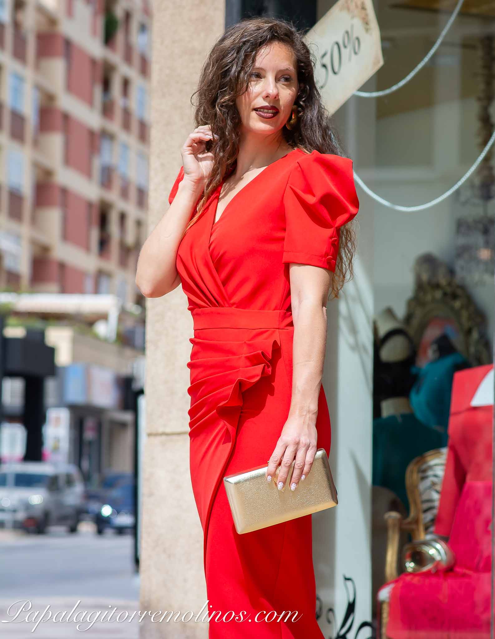 El diseño presenta escote cruzado en pico y mangas cortas abullonadas que aportan volumen y un aire sofisticado. La cintura drapeada estiliza visualmente la figura y da paso a una falda cruzada con abertura frontal asimétrica que aporta movimiento y un toque femenino.