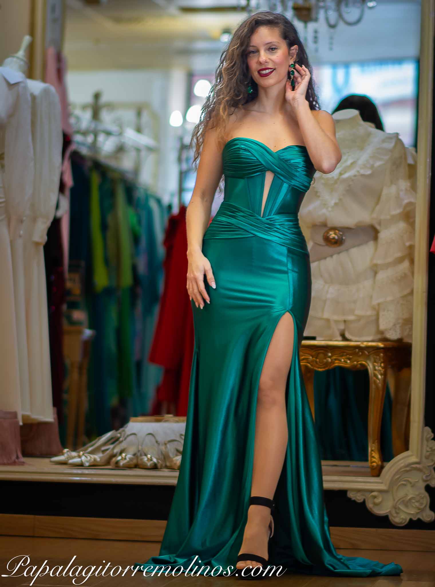 Precioso vestido largo, cuerpo estilo corset con escote de corazon. Falda ajustada con gran abertura, y espalda descubierta cruzada.
