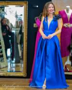 Precioso vestido largo , escote infinito , tejido mikado , abertura en falda , espalda escotada y aplique de flores y plumas en hombro .