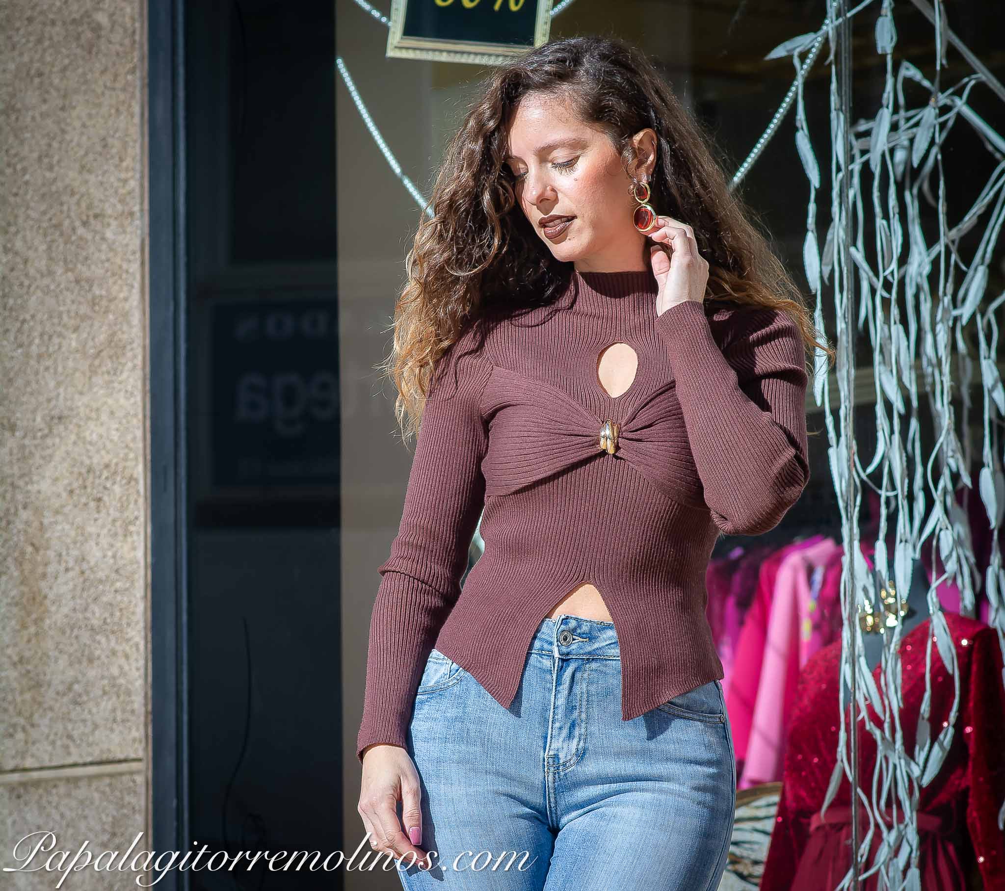 Precioso jersey de punto canalé elástico. Cuello alto con mini abertura en el escote, manga larga con detalle cut out en la cintura terminado en pico.
