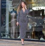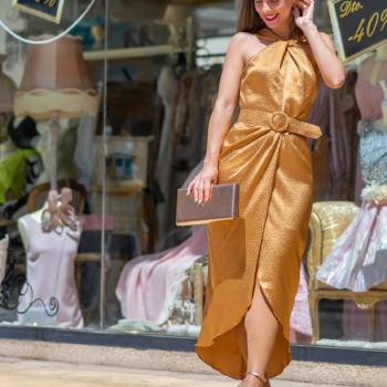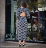 Precioso vestido midi ajustado, escote de pico con manga larga y hombros abullonados. Cuerpo fruncido, espalda descubierta con cierre de botones.